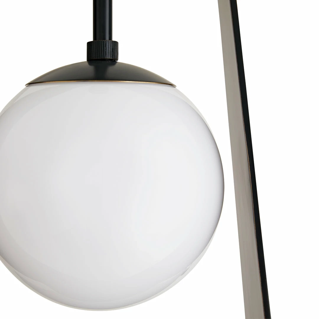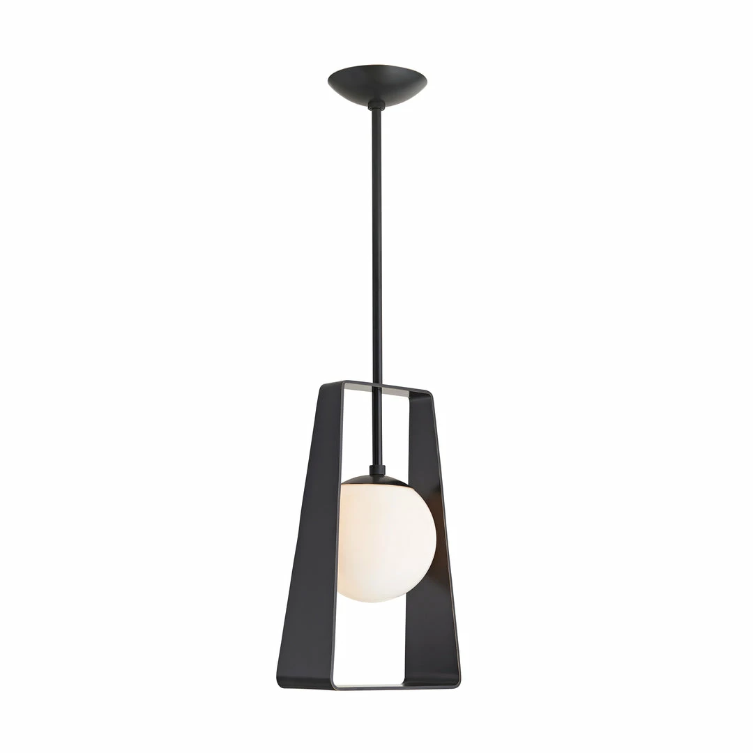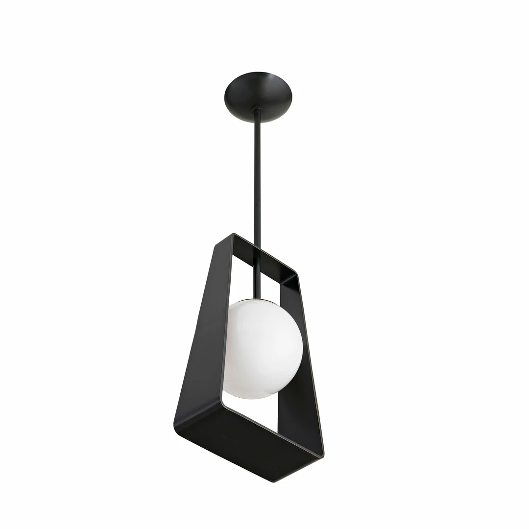 A MID-CENTURY TWIST ON A CLASSIC LANTERN SILHOUETTE, THIS PENDANT WAS MADE TO BE IN THE SPOTLIGHT. THE THICK BRONZE STEEL FRAME EXPANDS INTO AN ELONGATED TRAPEZOID SHAPE, CREATING A GEOMETRIC CONTRAST TO THE LARGE OPAL GLASS GLOBE. ITS OPEN-FORM CONSTRUCTION ALLOWS THE LIGHT TO PLAY WITH THE NEGATIVE SPACE AND ADD A SLIGHT SHEEN TO THE FRAME. GREAT FOR CONTEMPORARY SETTINGS IN NEED OF AN INDUSTRIAL TOUCH. DAMP RATED, THOUGH LIMITED OUTDOOR CONDITIONS MAY AFFECT FINISH.