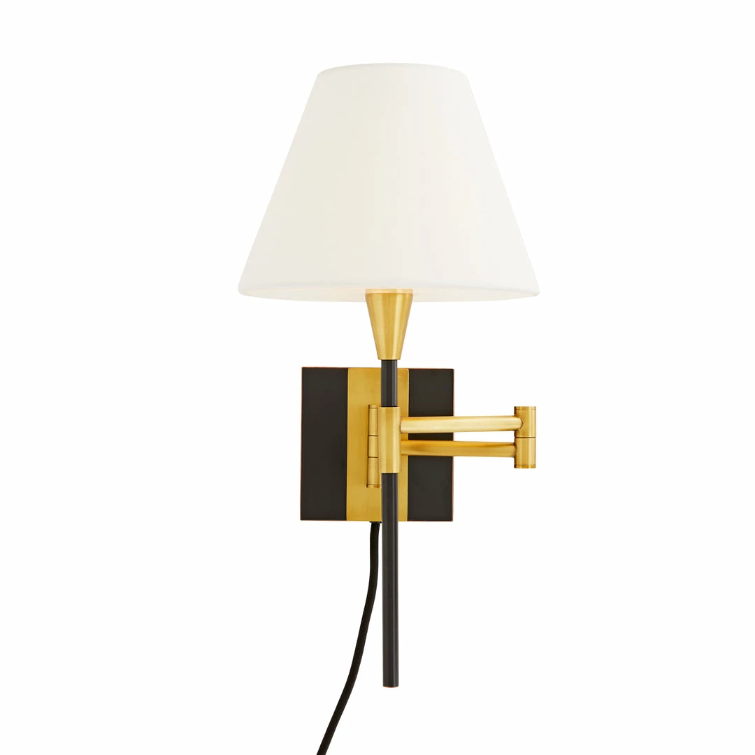 A DESIGN THAT DERIVES FROM TRADITIONAL ELEMENTS AND MODERN MATERIALS, THE HARTLEY IS SIMPLE YET STUNNING. THIS SCONCE FEATURES A CLASSIC WHITE LINEN SHADE THAT IS PERFECTLY PERCHED ON A STEEL ANTIQUE BRASS BASE. AN ADJUSTABLE ARM EXTENDS FROM A BRONZE STEEL PLATE, SO YOU CAN EASILY PIVOT IT INTO THE DESIRED DIRECTION. WITH AN ACRYLIC DIFFUSER TO SOFTEN THE LIGHT AND A CORD TO MAKE IT PORTABLE, THIS SCONCE WORKS WELL IN A LIBRARY OR BEDSIDE. DAMP RATED, THOUGH LIMITED OUTDOOR CONDITIONS MAY AFFECT FINISH.