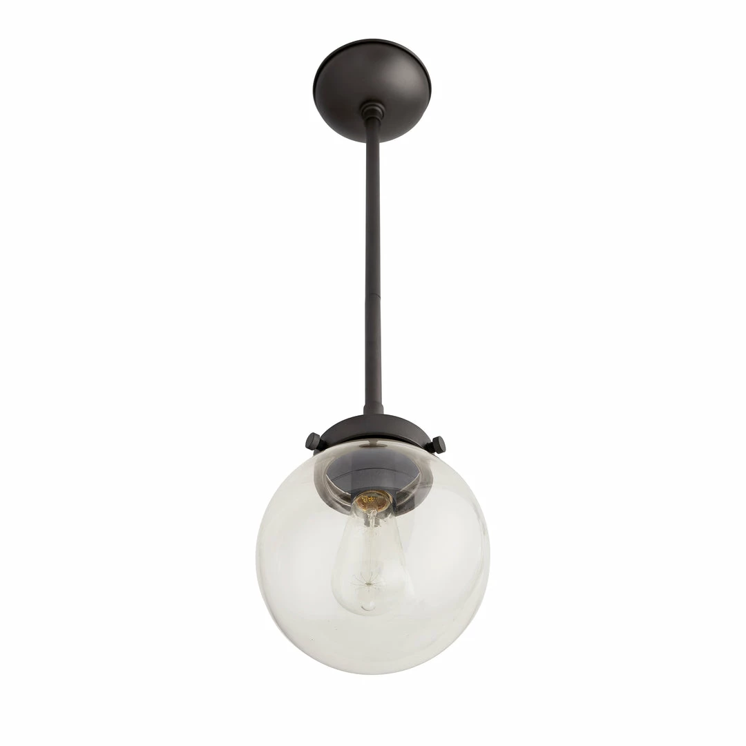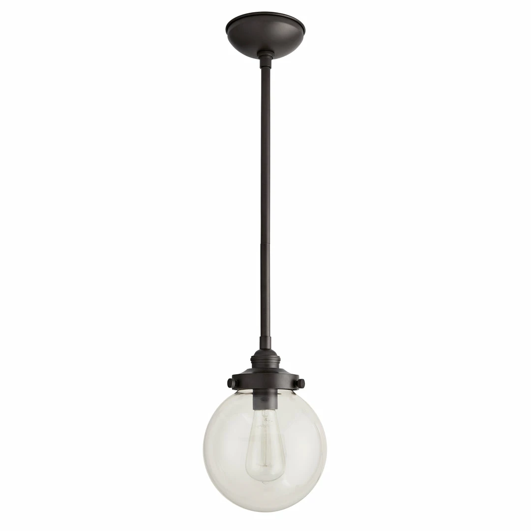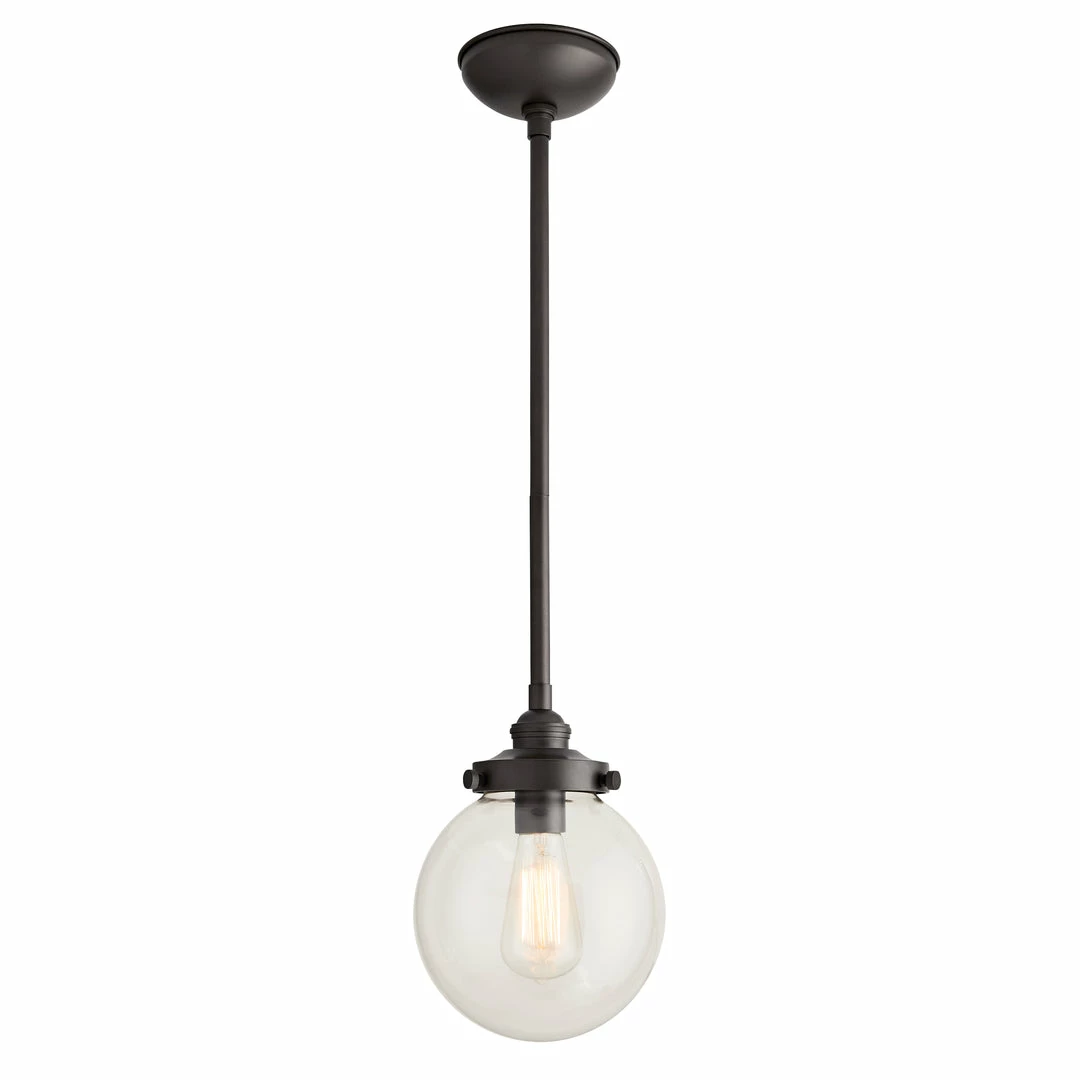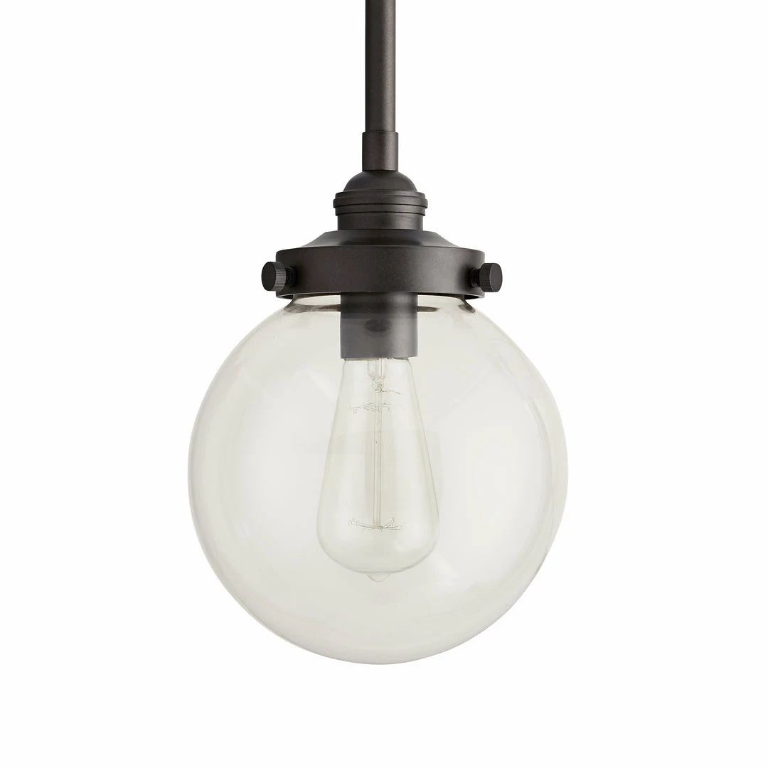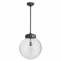 Light a space with timeless design. This classic globe pendant features a clear glass shade and aged iron finished steel giving it an updated industrial style. Consider an antique style bulb to create a subtle glow with stylized filament designs. Shown with an Edison bulb. Approved for use in outdoor areas.