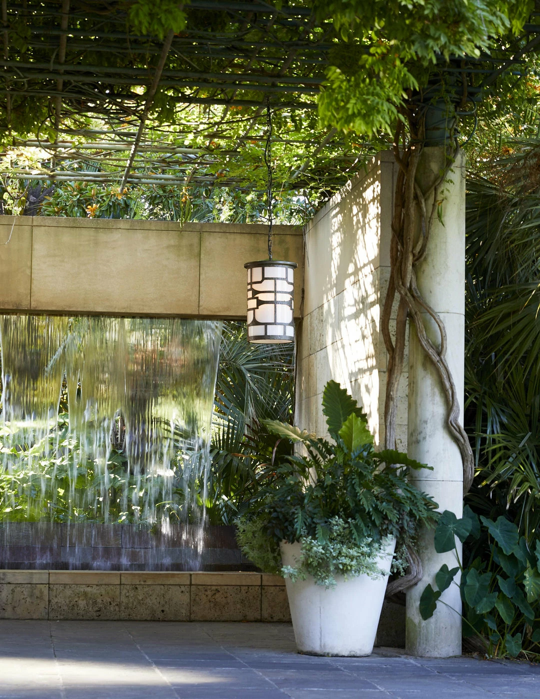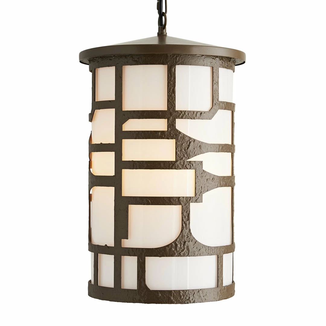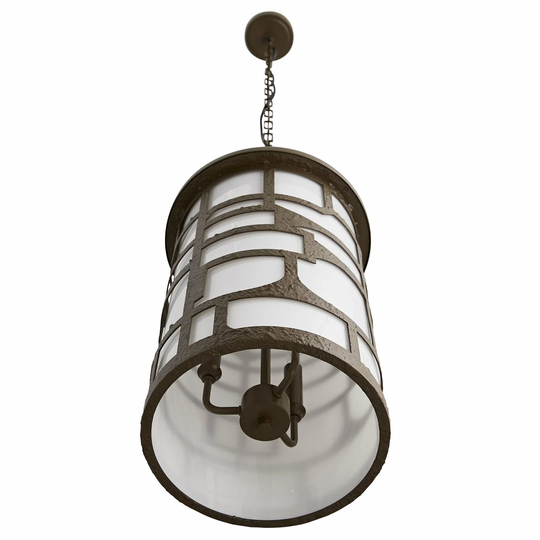 The mid-century craftsman style of this pendant light makes it intriguing and modern while its grand scale gives it presence. The steel frame is almost sculptural featuring a linear pattern that is hammered and finished in aged brass adding to the mid-century modern feel. It conceals a sleeve of opal glass that filters the light from three bulbs so the light it emits spreads warmly outward and openly downward. Approved for outdoor use.