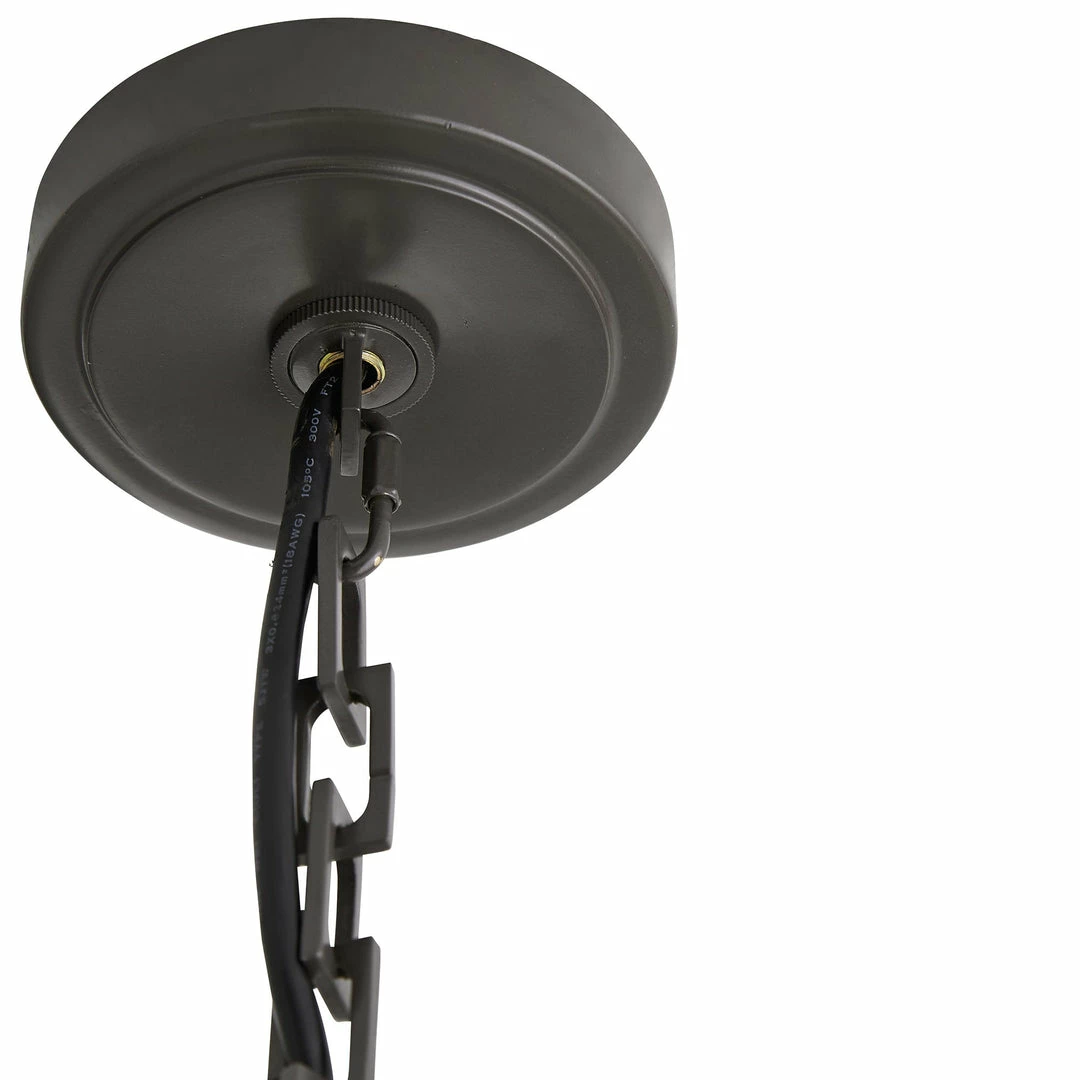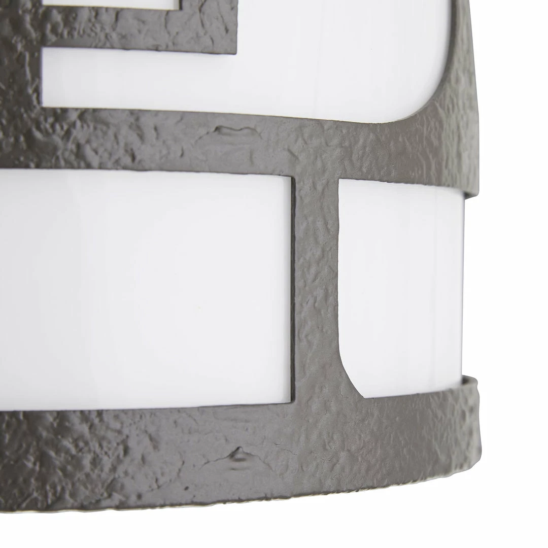 The mid-century craftsman style of this pendant light makes it intriguing and modern while its grand scale gives it presence. The steel frame is almost sculptural featuring a linear pattern that is hammered and finished in aged iron adding to the mid-century modern feel. It conceals a sleeve of opal glass that filters the light from three bulbs so the light it emits spreads warmly outward and openly downward. Approved for outdoor use.
