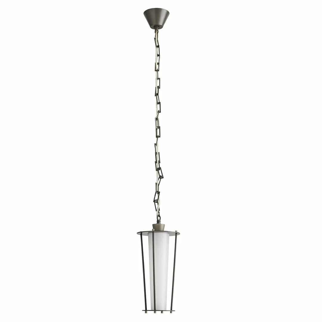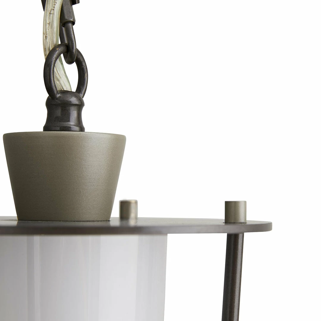 This handsomely structured lantern is upscale in form and style. It is made from aged iron finished steel tapered in form and designed with slight exposed details and contrasting nickel finish accents to exude an industrial feel. A sleeve of opaque opal glass rests inside filtering the light from a standard bulb. Approved for use in outdoor areas.