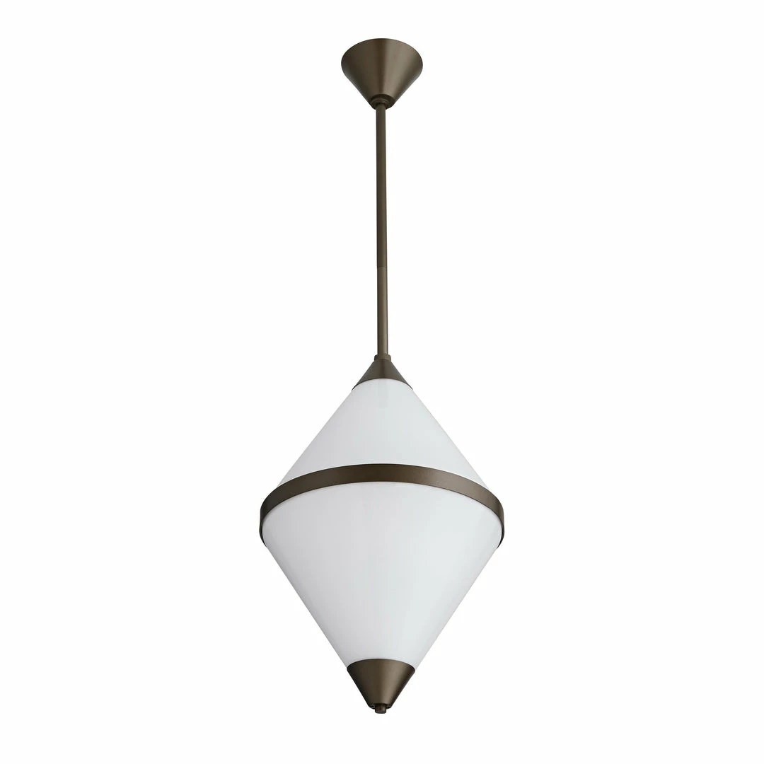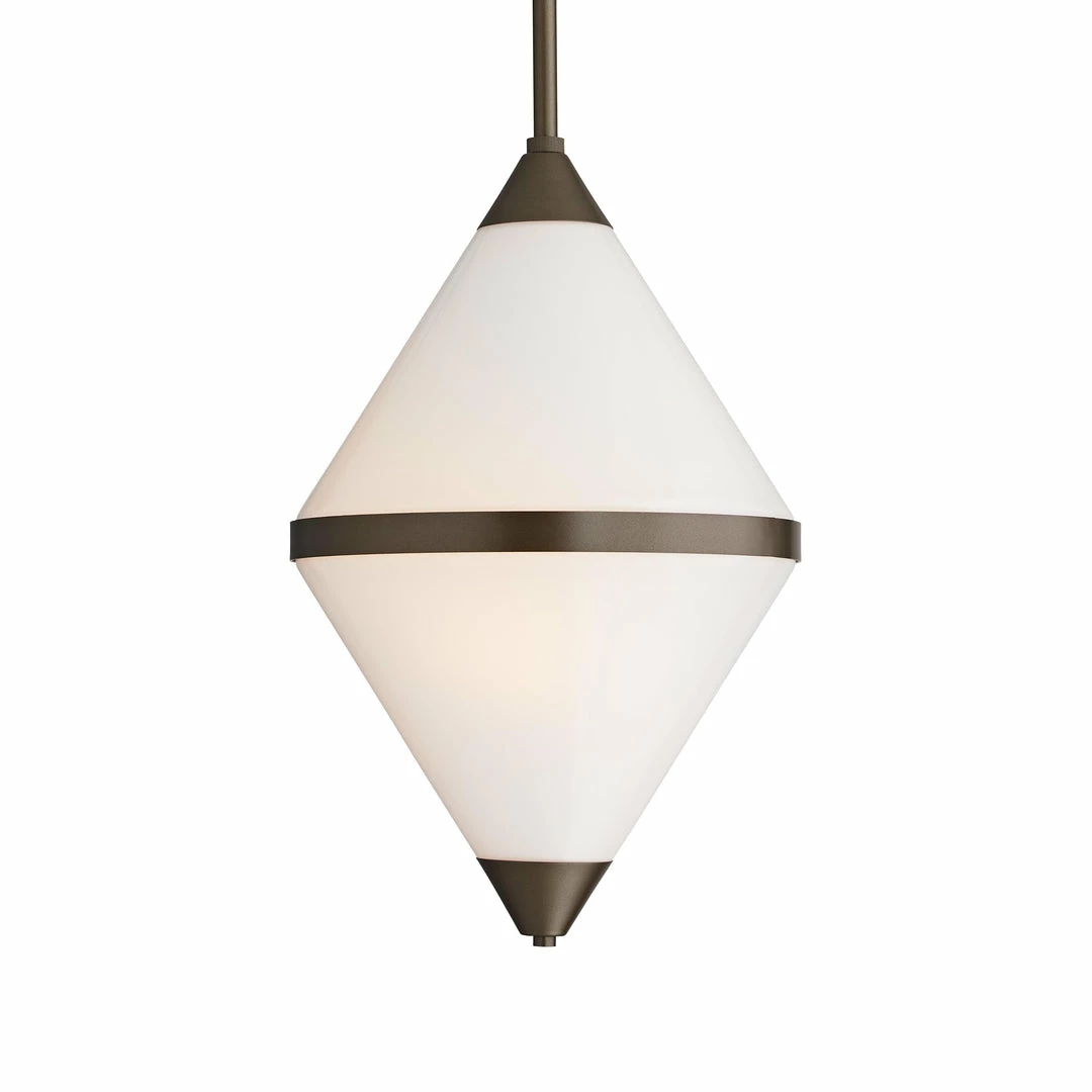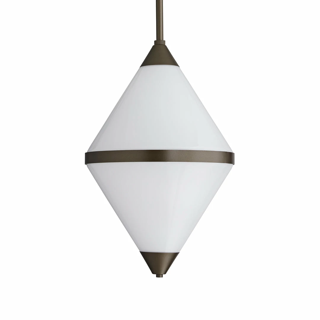 Create a unique lighting environment without compromising class. The tiered silhouette of the pendant features opal glass fashioned with an aged-brass finish steel belt forging a classic and clean style. The diamond-esque shape allows light to flow over any outdoor setup. Approved for use in outdoor areas.