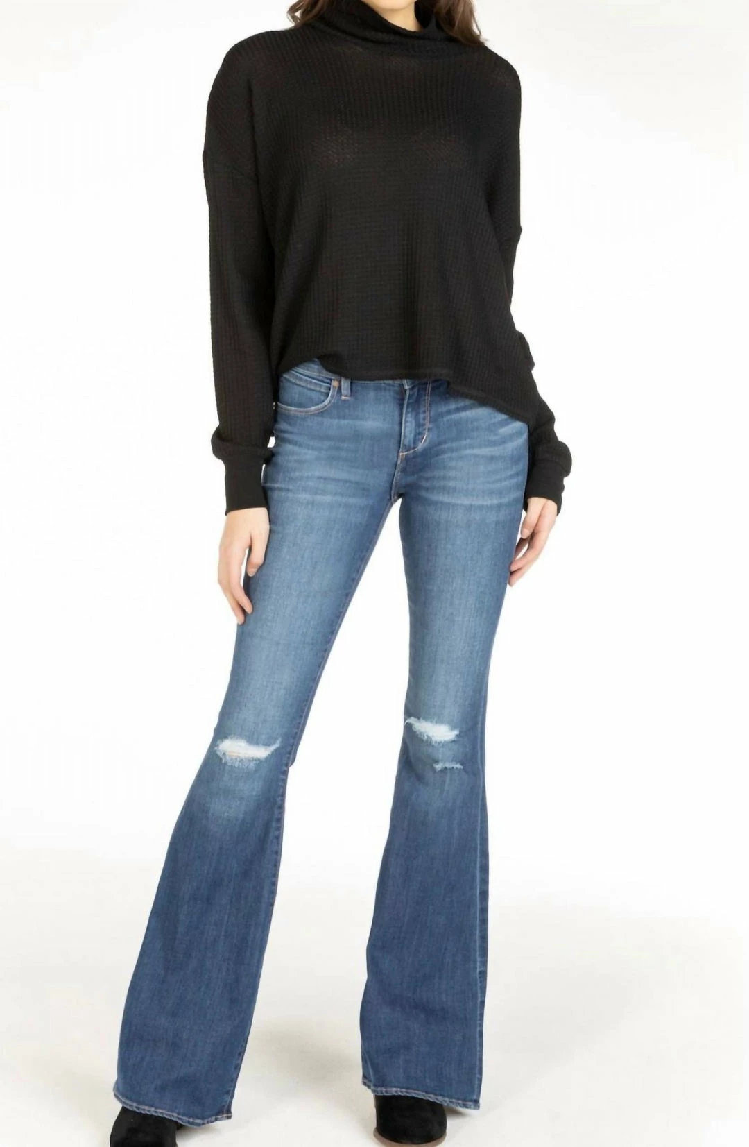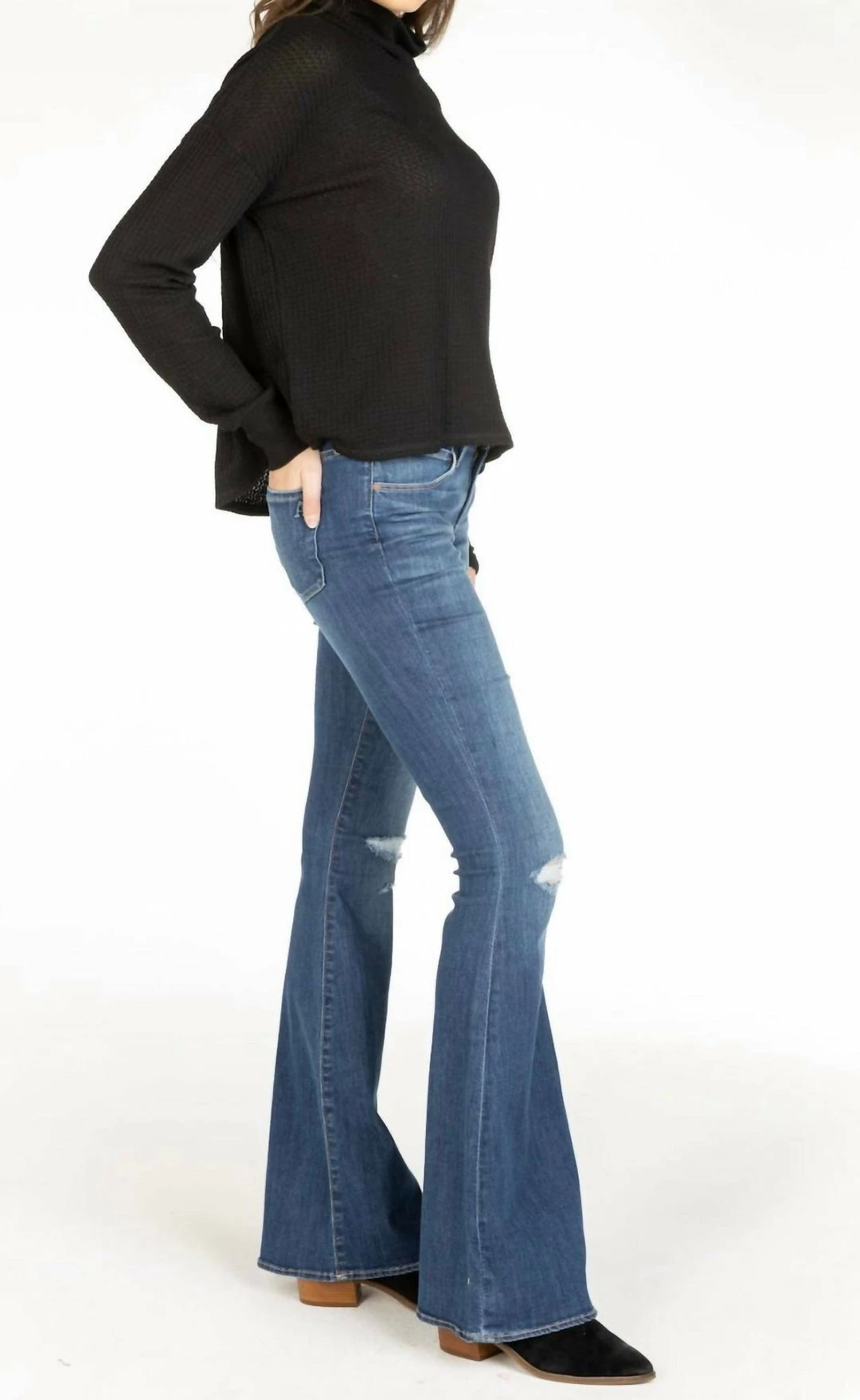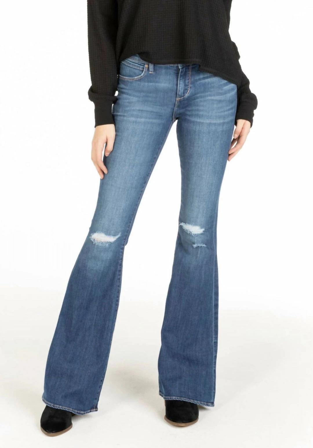 Mid-rise, classic 5-pocket style, flare leg jeans with light distressed detail.Material –  73% Cotton / 23% Polyester / 3% Rayon / 1% SpandexFit – True-to-Size