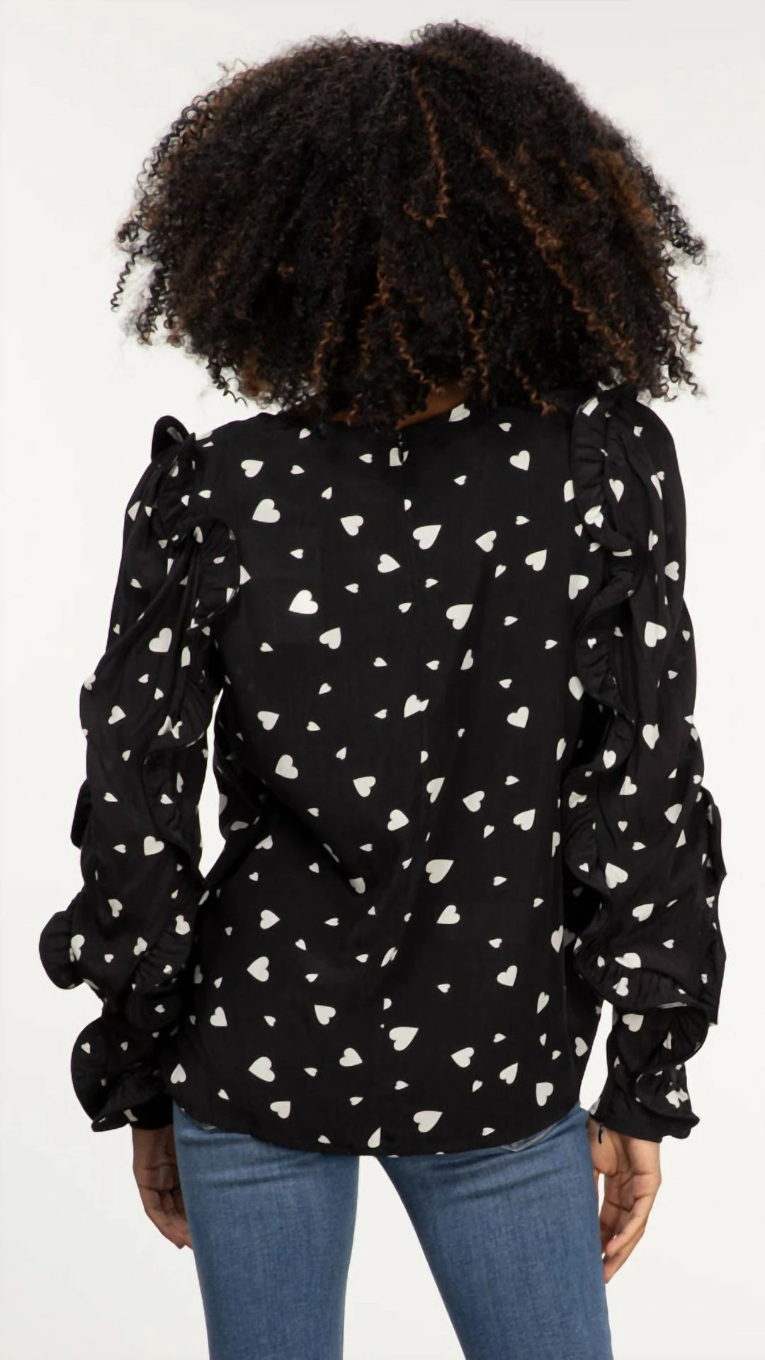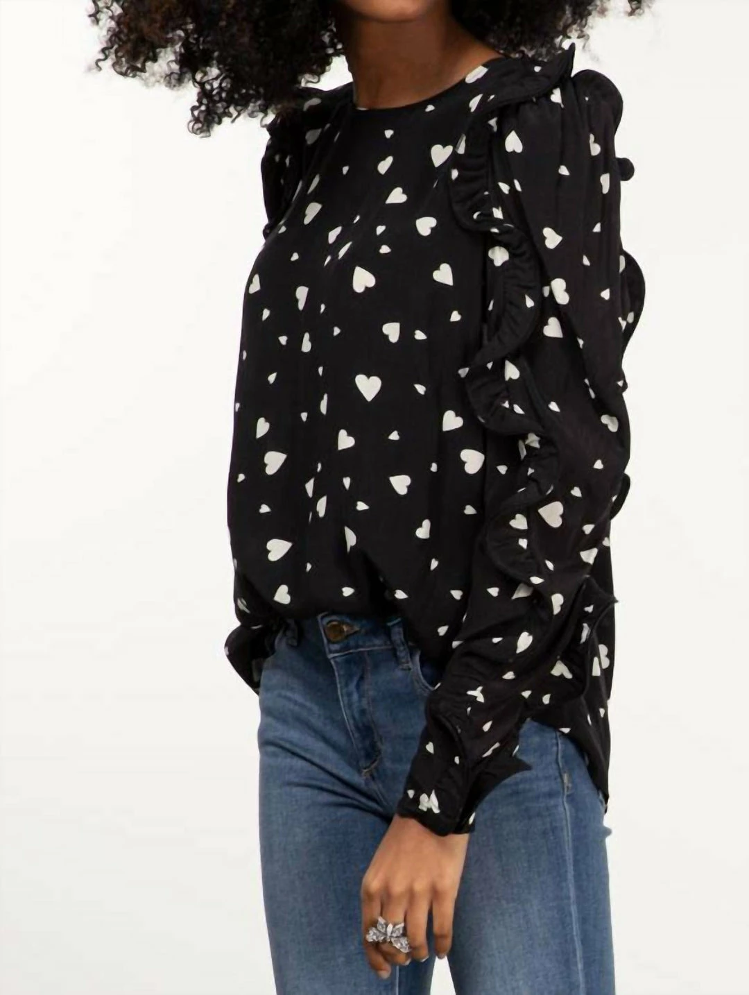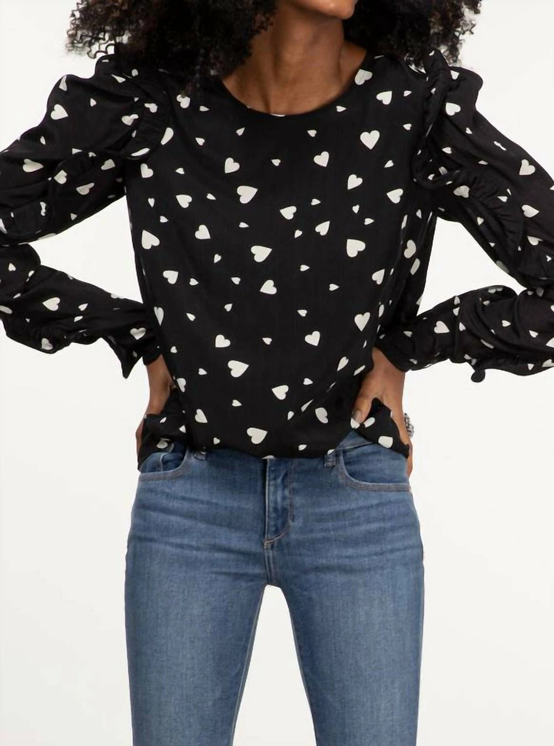Fluid top is printed with playfully scattered hearts. The sleeves are detailed with rows of small ruffles for an extra hint of volume.Hidden zip fasteningRelaxed fitRuffled sleevesModel is 5’5″, wearing size 34