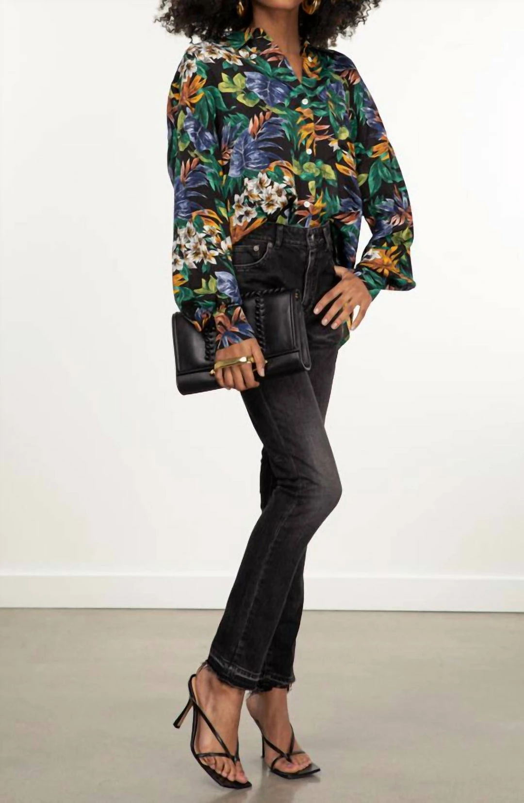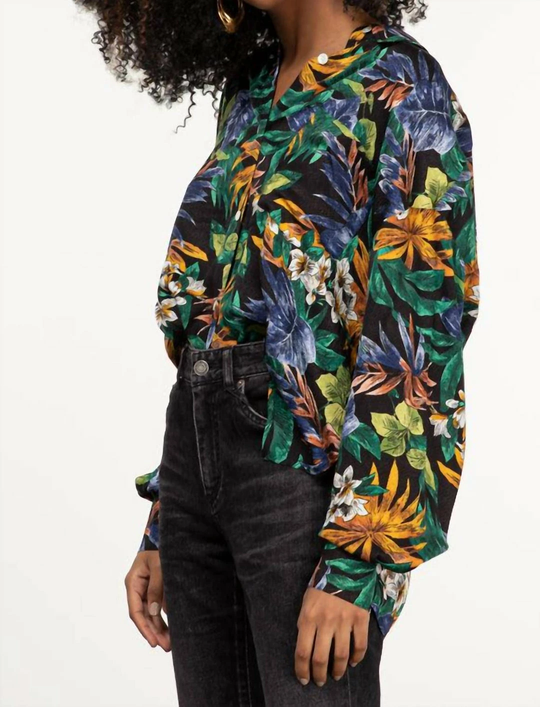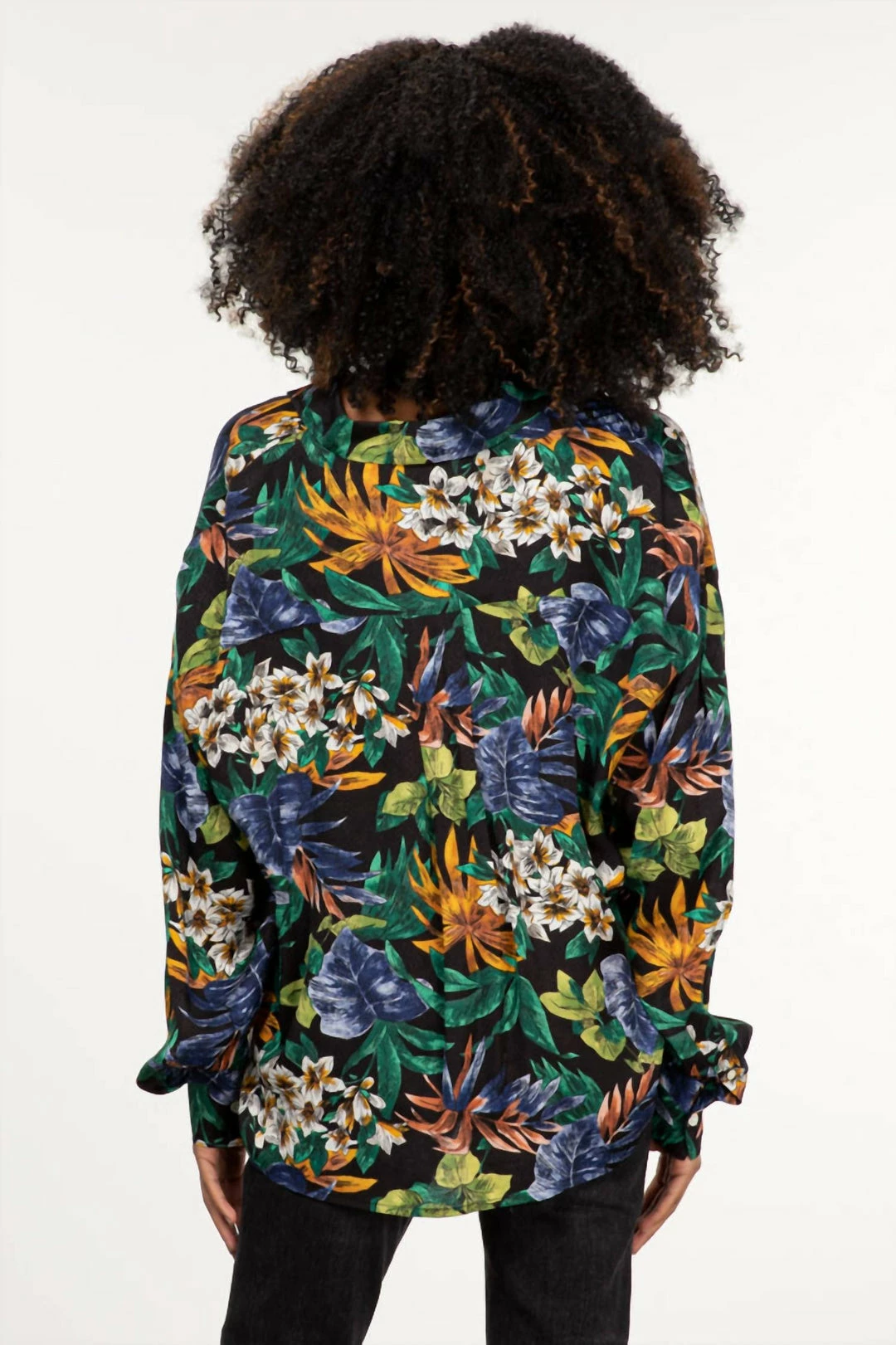 Printed with vibrant floralsVoluminous sleevesPatch pocketDropped shouldersOversized fitModel is 5’5″, wearing size XS