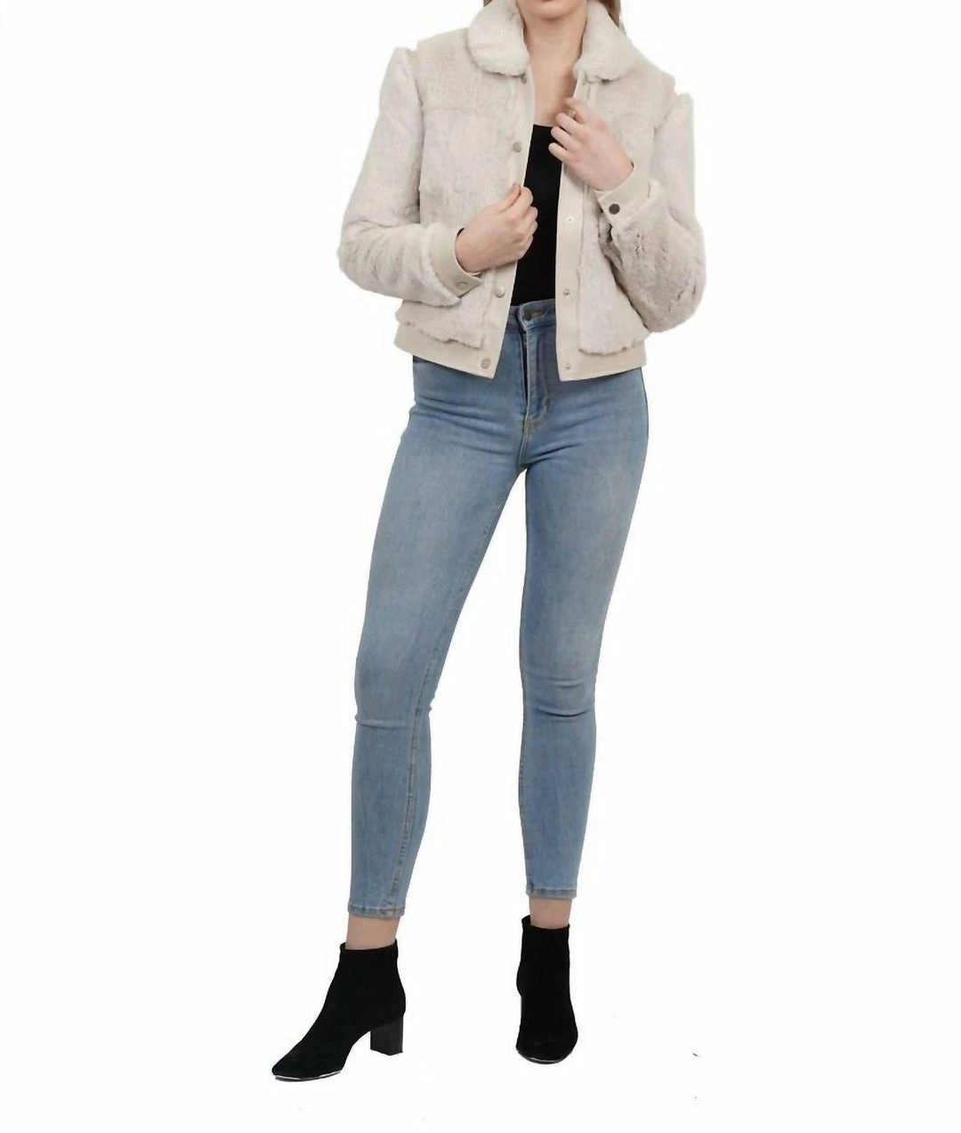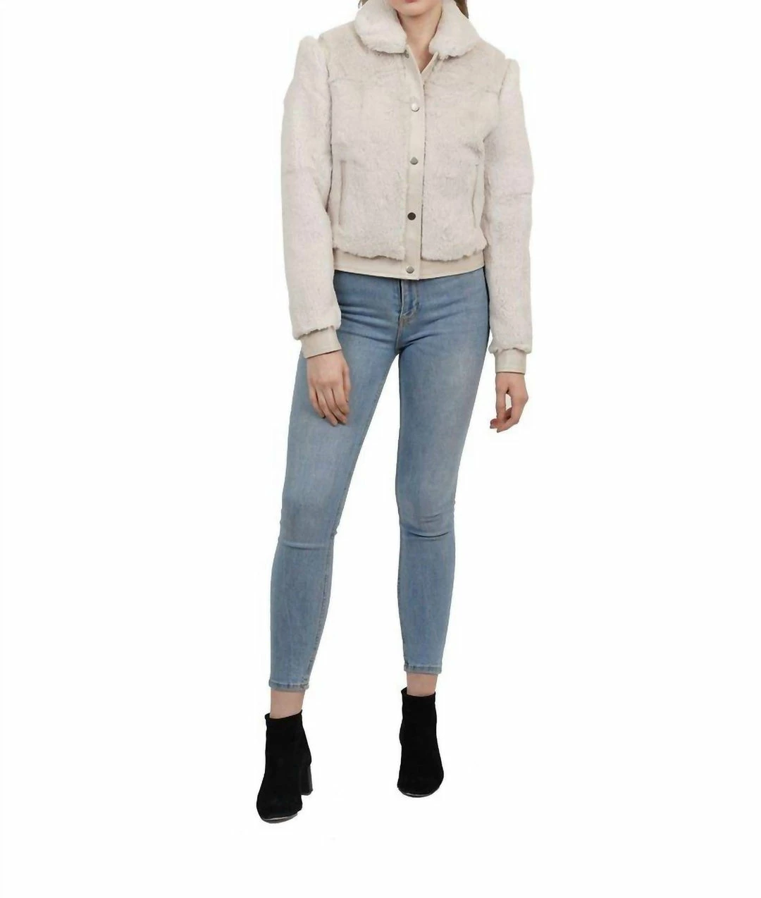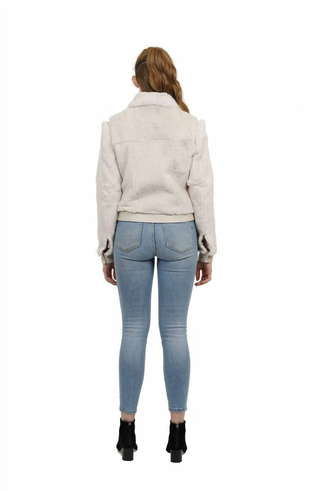 Bomber style jacket for this fall and winter, with genuine leather trim and real rabbit fur. Casual and timeless, with a luxury twist! Snap button front enclosures. Cropped hem sits above the hip.