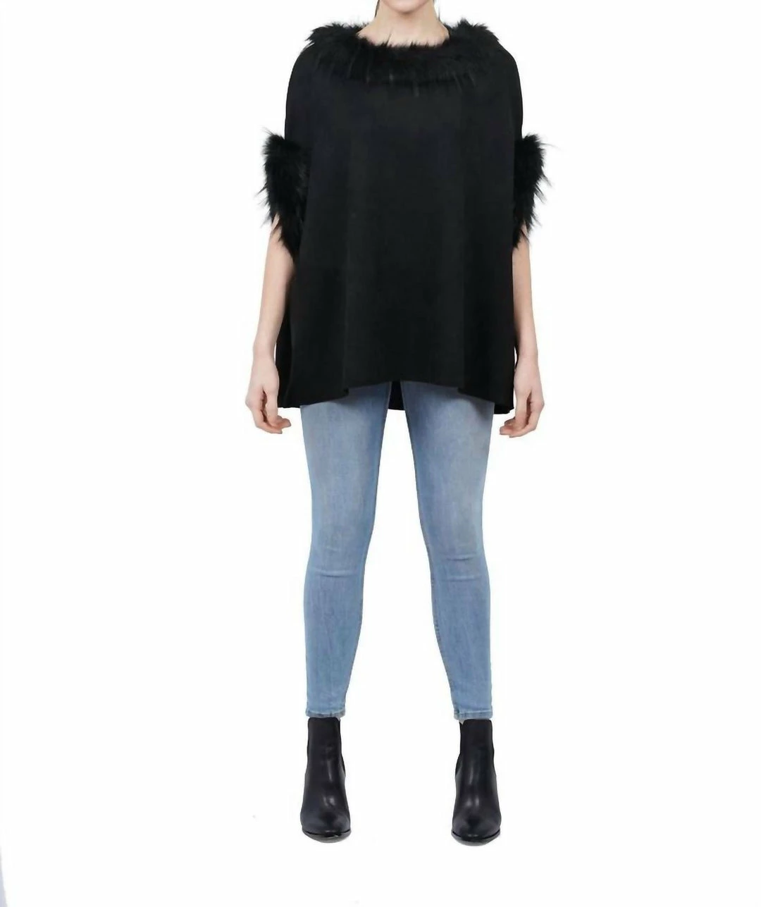 Loose, roomy and more forgiving. A good drapey poncho should always be in your closet. But a luxury sleeveless faux fur blouse is the must have this year. Faux fur trim around the neckline and arm holes.