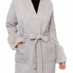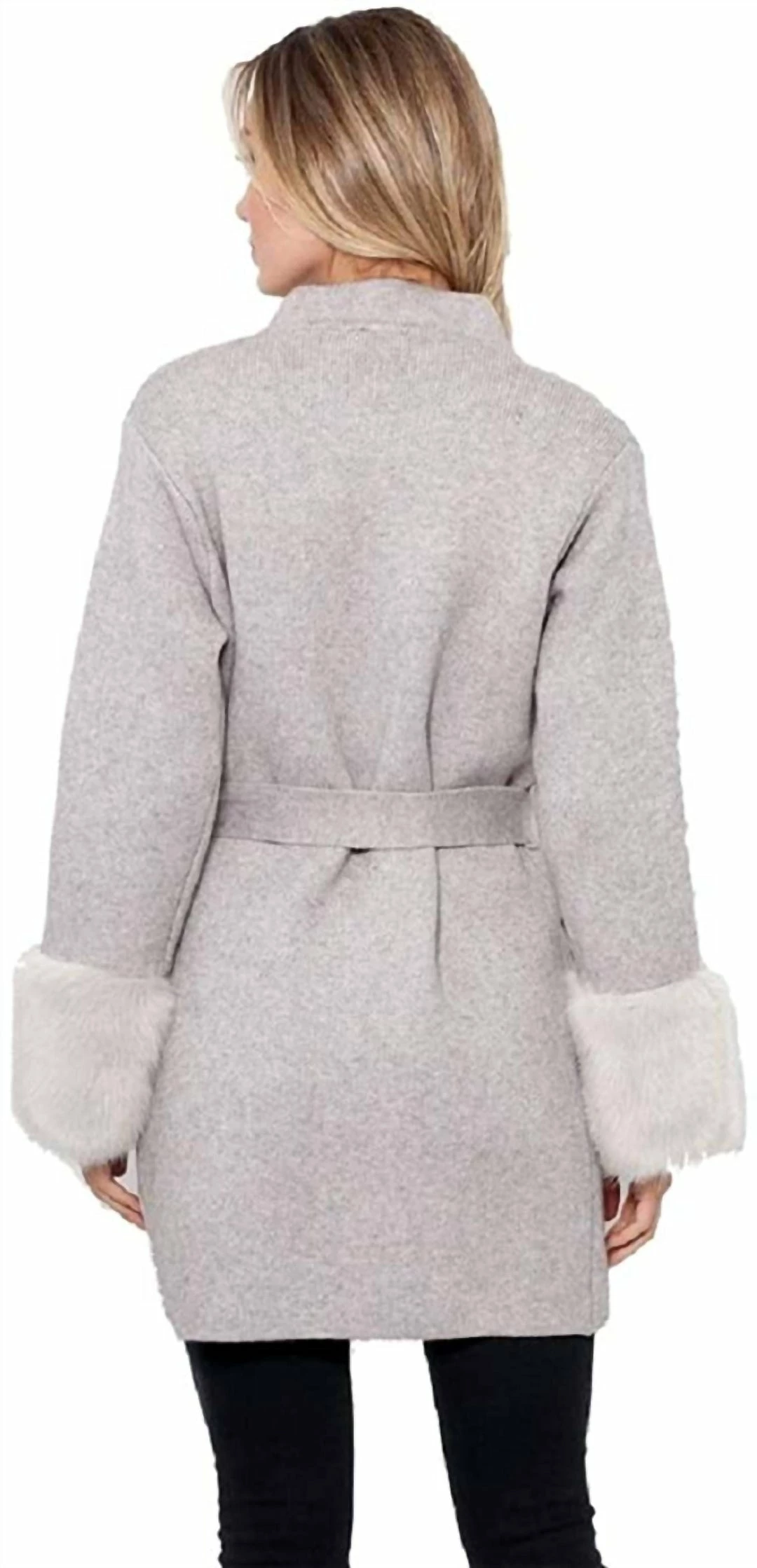 Medium Weight, Ultra soft, Thigh Length Knit Vest with Sleek Collar, Two (2) large front pockets, 2 inch wide waist -tie, and lux faux fur trim on the sleeves.Dry clean only