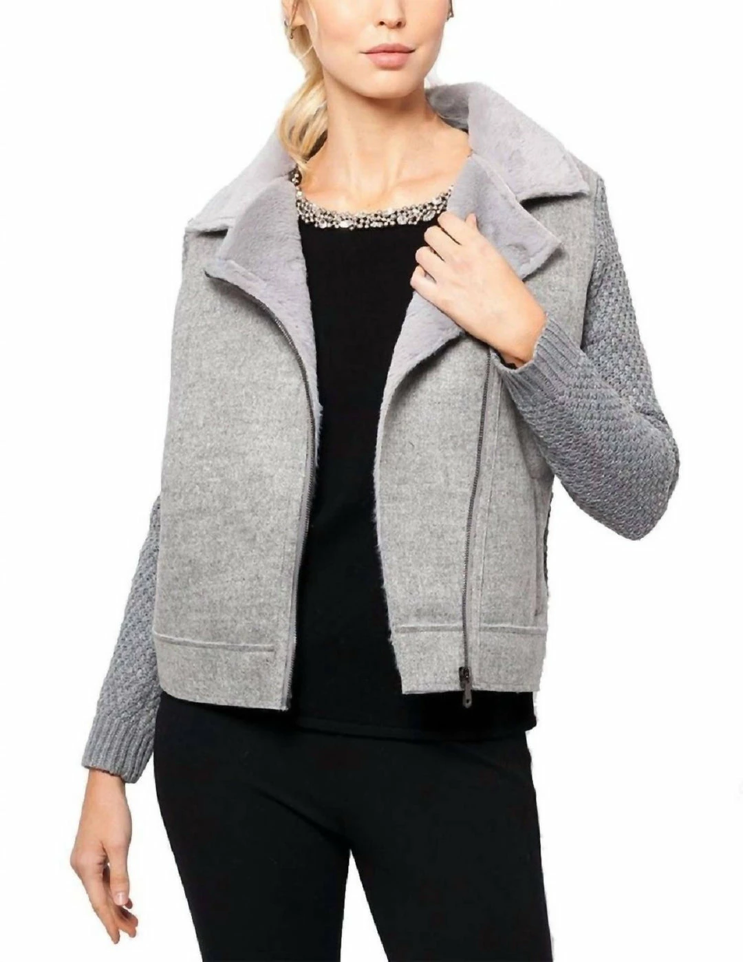 Motorcycle style cardigan with faux fur collar, double breasted blend-in zipper. side pockets and knit sleevesDo Not Bleach / Do Not Tumble Dry / Iron Low / For Best Results Dry CleanStay cozy while looking edgy in your Margo Moto Cardigan!