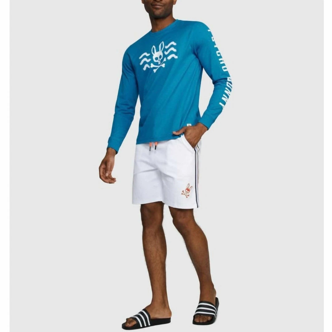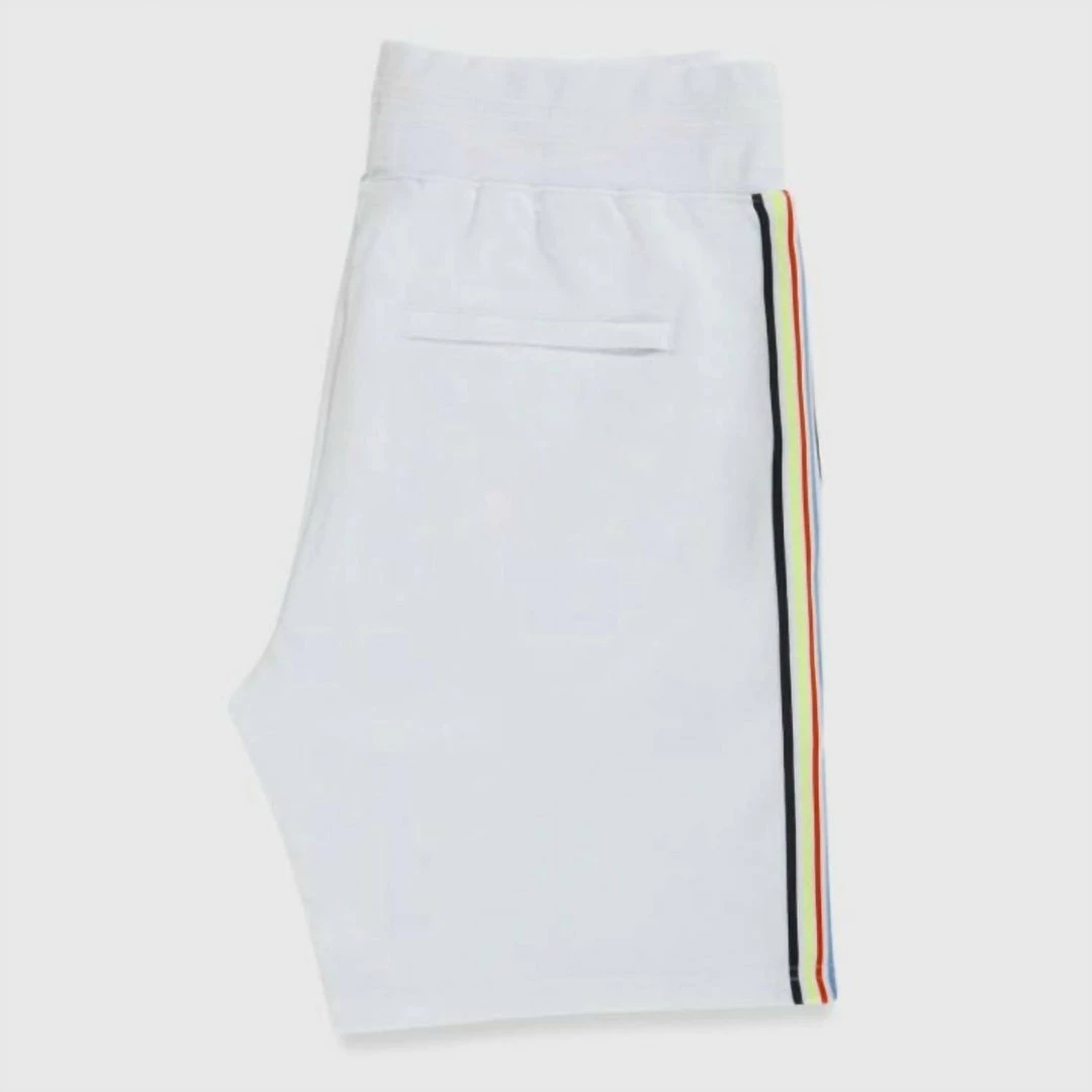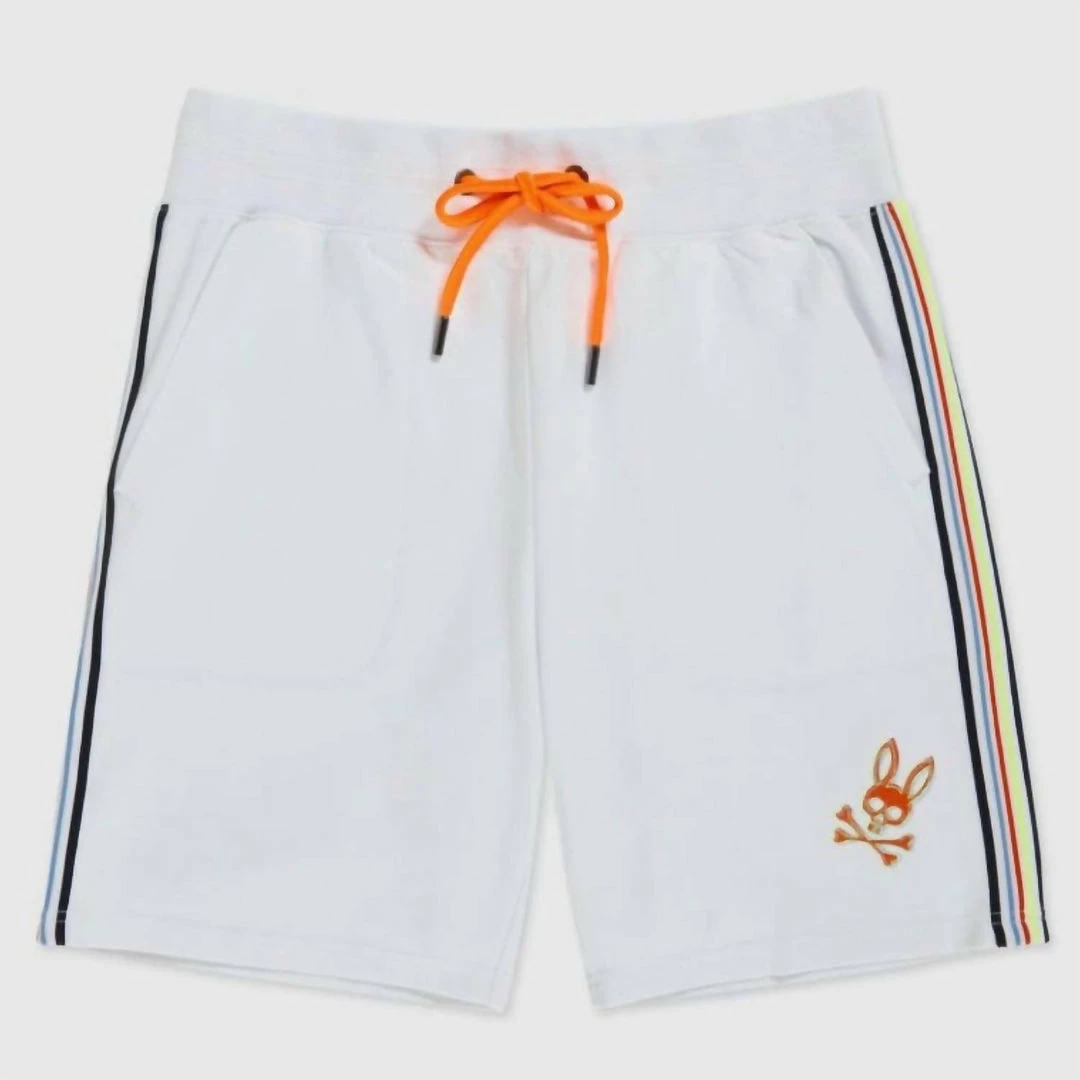 Sport your stripes with our mens Keswick sweat shorts. The Keswick sweat shorts are crafted from 100% cotton, finished with a drawstring waistband and outfitted with three pockets, including a zippered one at the rear. The Keswick features a stylized Psycho Bunny logo printed on the left thigh, with embroidered outlines, adding a touch of texture and character. Sporty multicolor stripes down the leg stand apart at every turn.100% cottonDrawstring waistbandThree pocketsPrinted and embroidered Psycho Bunny logo