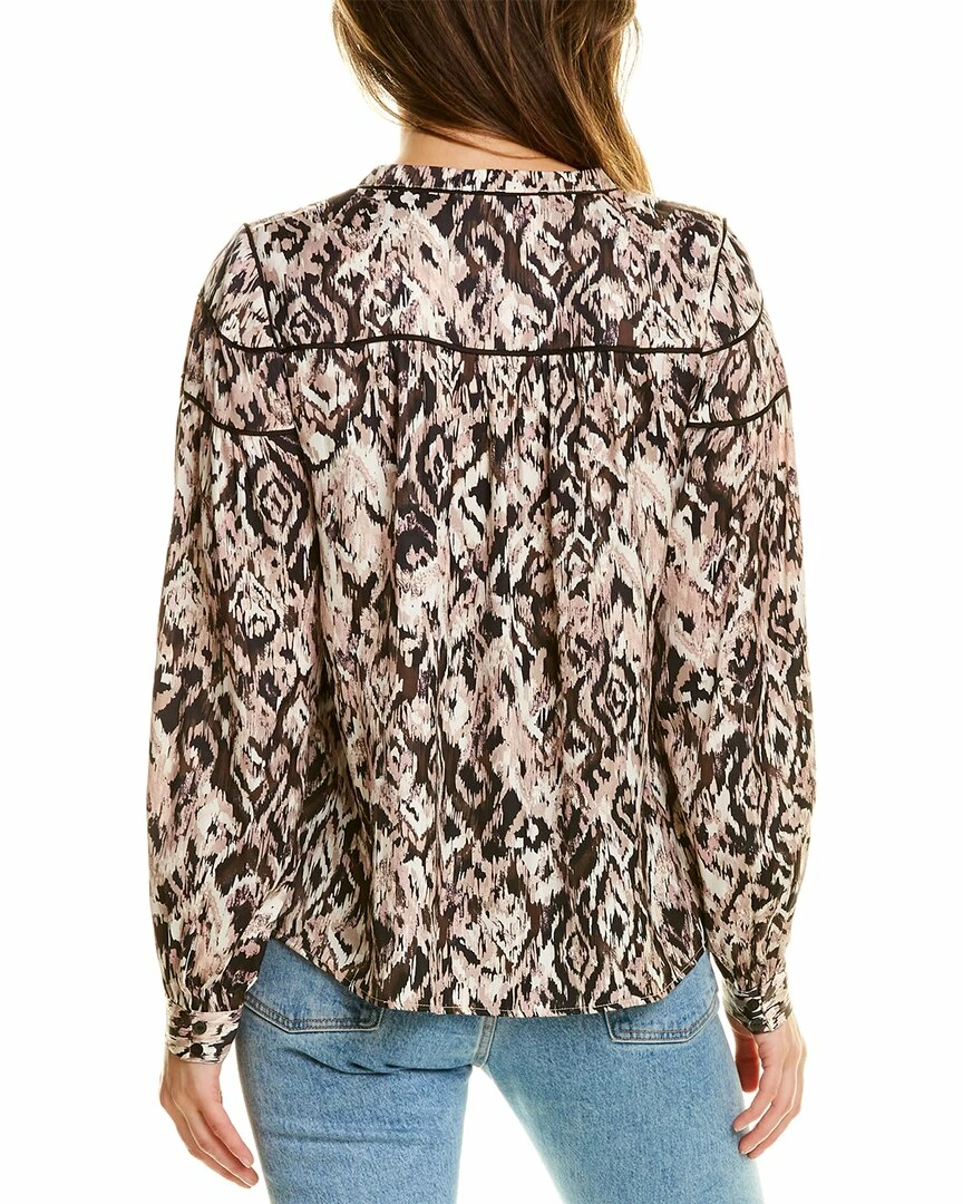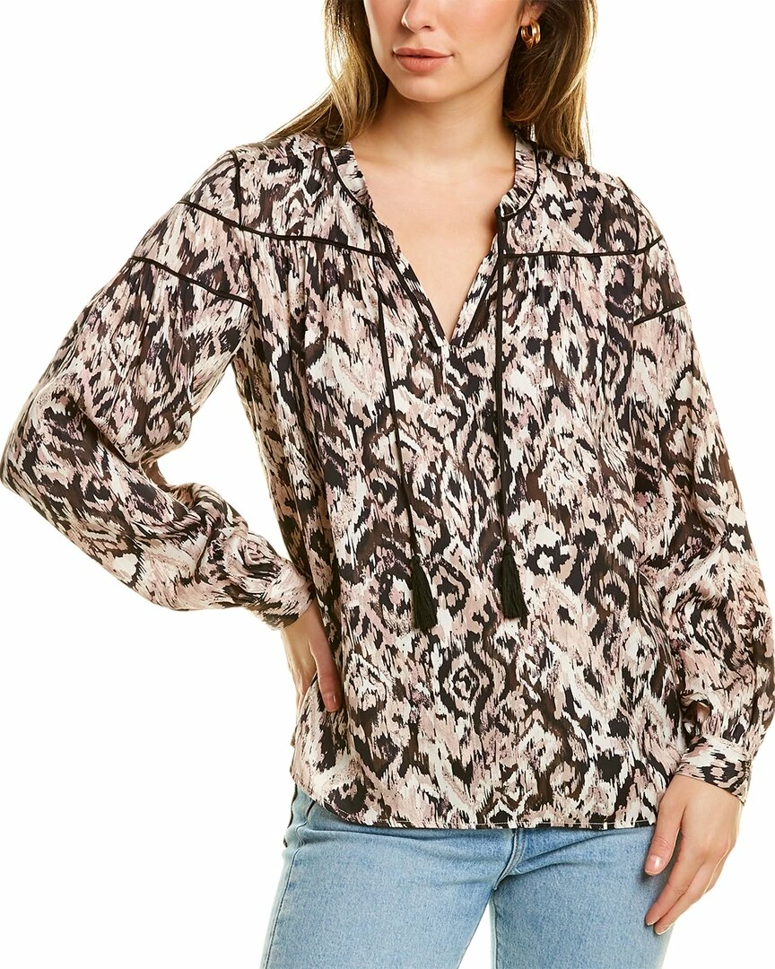 - Long Sleeve Ames Top In Marbled Ikat With Tassel Neck Tie, Blouson Sleeve, And Button Cuff