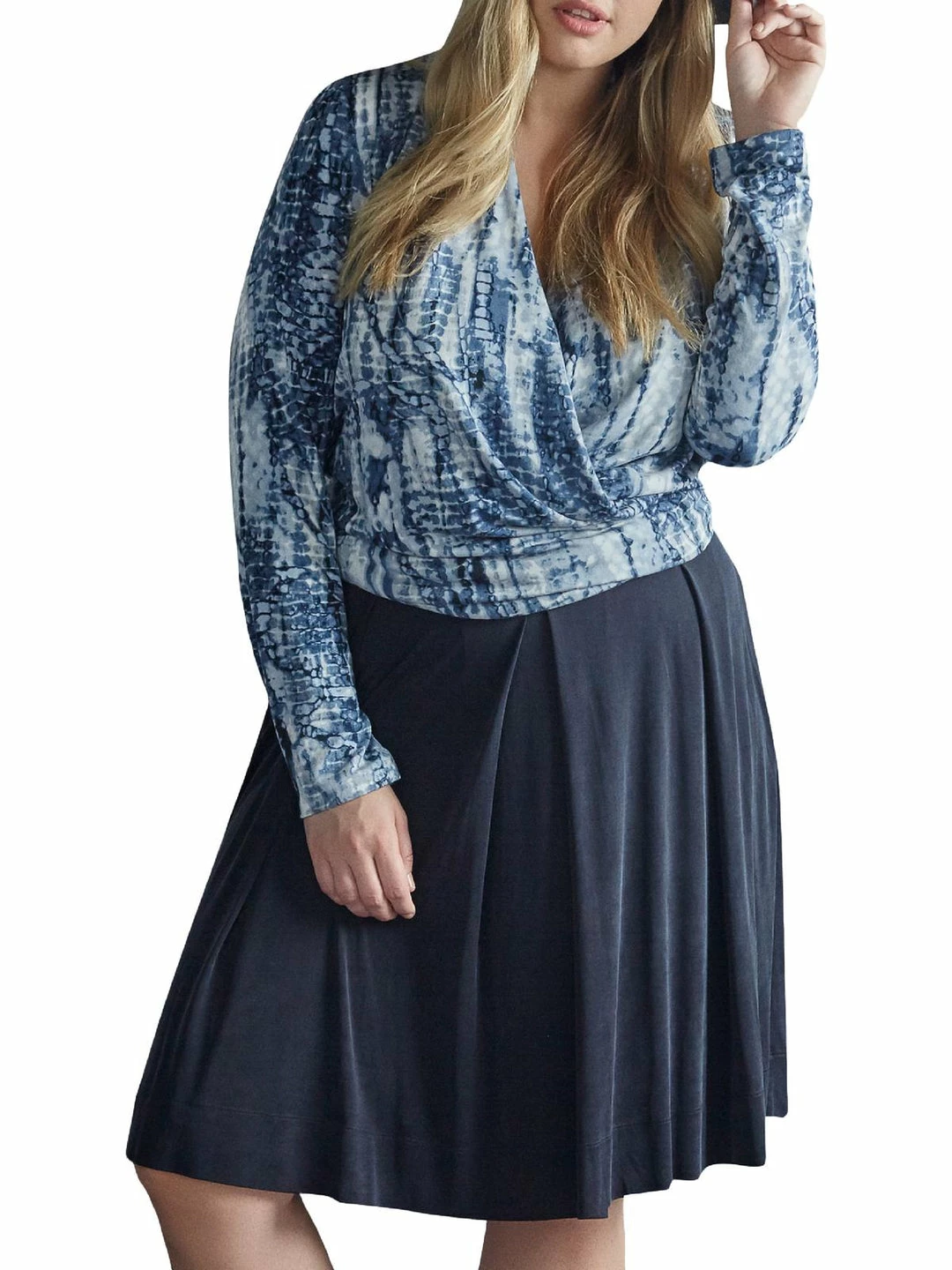 All eyes will be on you in the Sarah printed plus size wrap top by Tart Collections. Made with 95% modal and 5% spandex. The elegant faux wrap construction and whimsical print offer sexy statement making style | It’s versatile design will make it an essential for day to night wear. Pair it with all your favorite denim, workwear, or skirts to create your own look. Long sleeves. Pull on. This top is guaranteed authentic.