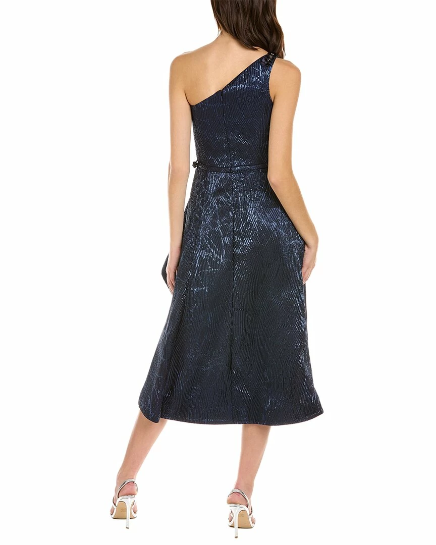 - A-Line Dress In Navy With One-Shoulder Style, Sequin And Rhinestone Embellishment, And Ruffle Cascade At Left Side