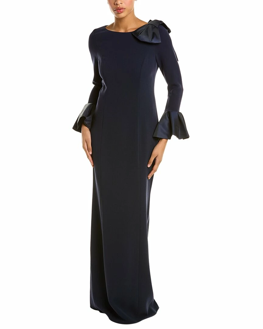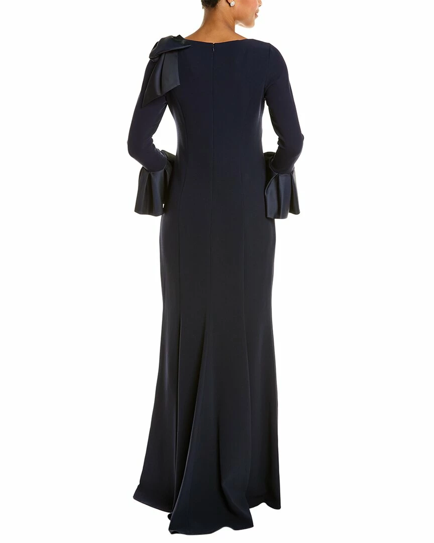 - Crepe Column Gown In Navy With Oversized Bow On Left Shoulder And Exaggerated Flare Cuffs